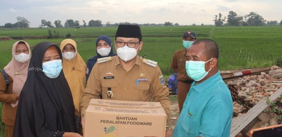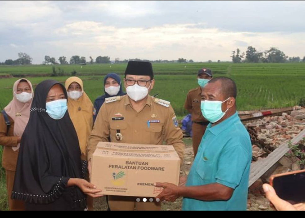 METRO – Walikota Metro, dr. Wahdi didampingi oleh Kadis Sosial Kota Metro, Kepala BPPD, Camat Metro Selatan dan Lurah Margodadi menyerahkan bantuan bagi korban bencana puting beliung di Kelurahan Margodadi (10/01/2022).